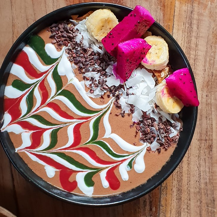 Největší peckou, co jsem tu měl, bylo rozhodně organické proteinové smoothie – Chocolate mocha. Nevzpomínám si, že bych někdy v životě měl lepší nakopávač. Kombinace čerstvého kokosu, banánu, oříškových másel, kakaových bobů se sílou dvojitého expressa mě vystřelila až na měsíc.