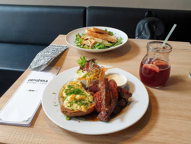 Na oběd jsme měli několik tipů na místní podniky. Jako číslo jedna pro návštěvu se nám jevilo bistro Drogérka. Menší bistro se nachází v samém středu města jen kousek od náměstí. Po vstupu vás hned oslní celá řada desertů. Moderní lehce industriální design podniku kazí jen skříň s wi-fi routerem, který by šlo určitě nějak lépe zamaskovat. Všiml jsem si nezvykle vysokých stropů, které přidávají bistru trochu na vzdušnosti, ale ubírají na intimitě. Na sezení je tu si deset menších stolů. Vetší skupina by tu měla trochu problém se poskládat. To jsme vlastně měli málem i my, protože při našem příchodu bylo úplně narváno. Měli jsme však štěstí a lidé u jednoho ze stolů už byli na odchodu a my se s nimi v mžiku vyměnili.